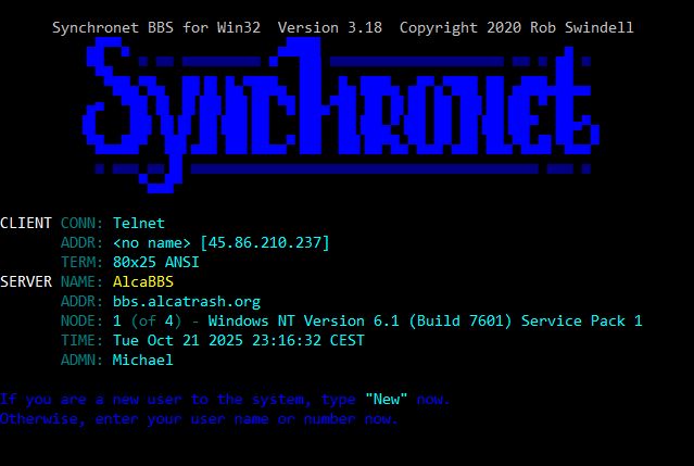 AlcaBBS October 21, 2025 sysop Telnet:bbs.alcatrash.orgSoftware:SynchronetConnection:TelnetLocation:Rijssen, , The Netherlands Author: sysop My bio