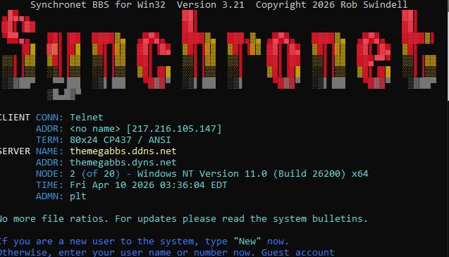 | Telnet: | themegabbs.ddns.net:6400 |