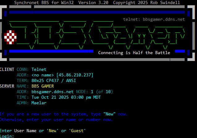 BBS Gamer October 21, 2025 sysop Telnet:bbsgamer.ddns.net:2600Software:SynchronetConnection:TelnetLocation:El Paso, TX, USA Author: sysop My bio