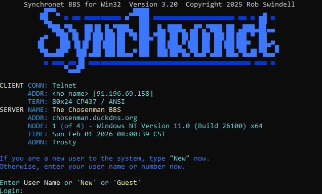 | Telnet: | chosenman.duckdns.org |