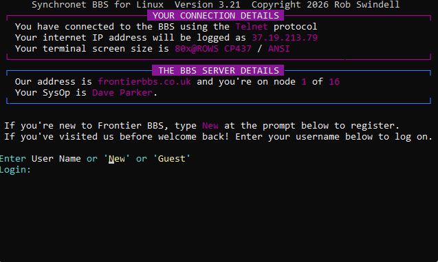 An easy going BBS from the UK. Frontier BBS originally ran between 1988 to 1993. Now revived using modern software. Frontier BBS is also where ThatC64Guy will be uploading his Commodore programs. We carry Fido, DoveNet and fsxNet message boards. Come stop by and say hello!