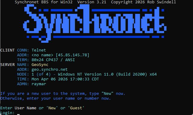 GeoSync April 6, 2026 sysop Telnet:geo.synchro.net:223Software:SynchronetConnection:TelnetLocation:Texarkana, TX, USA Author: sysop My bio