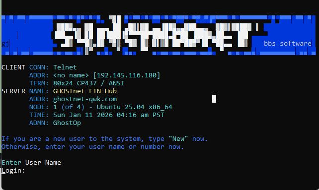 GhostNet FTN Hub December 11, 2025January 11, 2026 sysop Telnet:alphacomplex.us:2423Software:SynchronetConnection:TelnetLocation:Berkley, CA, USA Author: sysop My bio