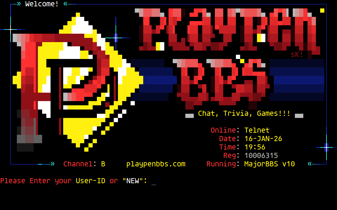 Now, after all these years, PlayPen BBS returns with most (hopefully all) of the old favorites. Games like T-LORD, Lunatix and Farwest Trivia! Several different Chats like Entertainment Teleconference, Chat Lounge and MajorLink and much, much more to come!!!