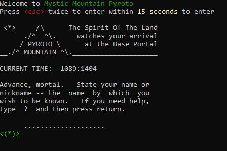 Experience the original Pyroto Mountain BBS. A mystical BBS adventure where wizards are on a quest to climb to the top of the mountain. It is not as simple as it sounds as each adventurer must not only be knowledgeable but well liked by The Spirit of the Land who controls the mountain.