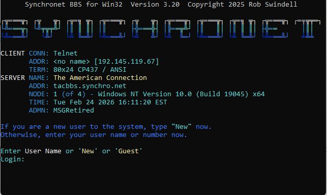 | Telnet: | tacbbs.synchro.net |