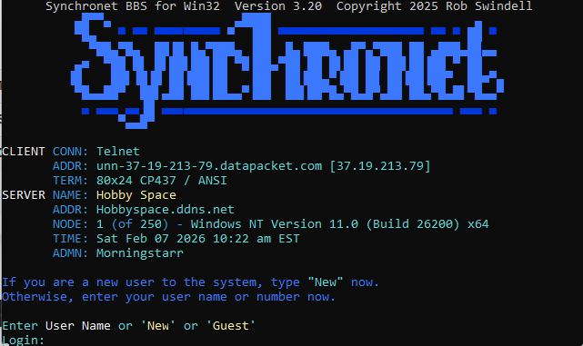 | Telnet: | hobbyspc.synchro.net |