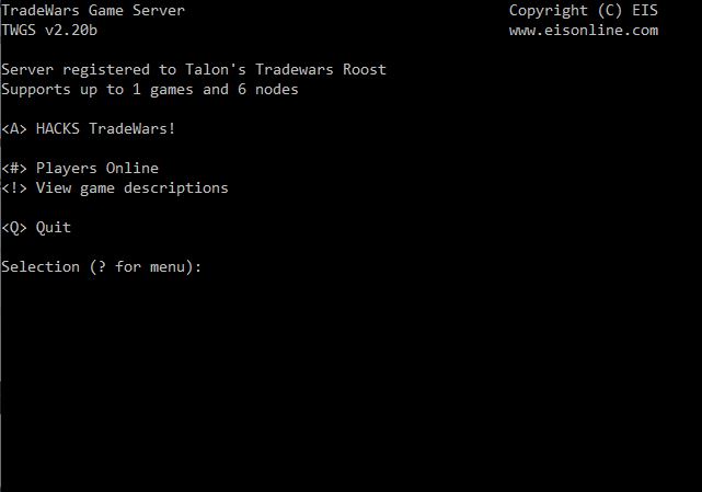 Trade Wars 2002 TWGS Server running 7 Games and 6 Nodes Brought to you by A-Net Online BBS – HTTP://a-net.fyi – Telnet: bbs.a-net.online Port: 2002