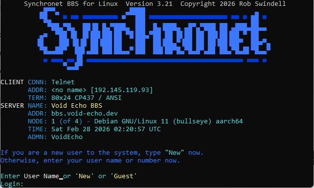 Void Echo BBS January 27, 2026March 28, 2026 sysop Telnet:bbs.void-echo.devSoftware:SynchronetConnection:TelnetLocation:Kyiv, , Ukraine Author: sysop My bio