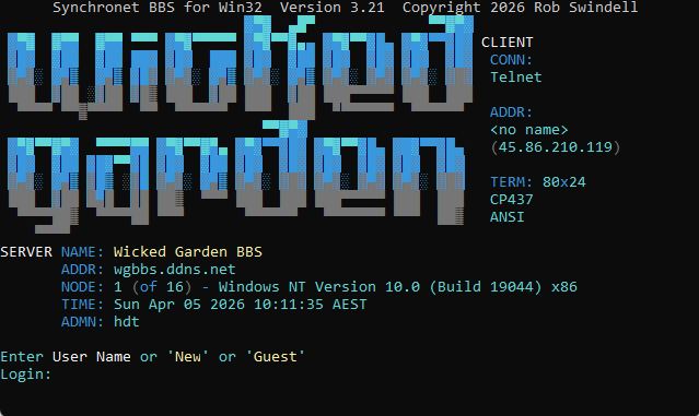 Wicked Garden BBS April 4, 2026 sysop Telnet:wgbbs.ddns.netSoftware:SynchronetConnection:TelnetLocation:Melbourne, VIC, Australia Author: sysop My bio